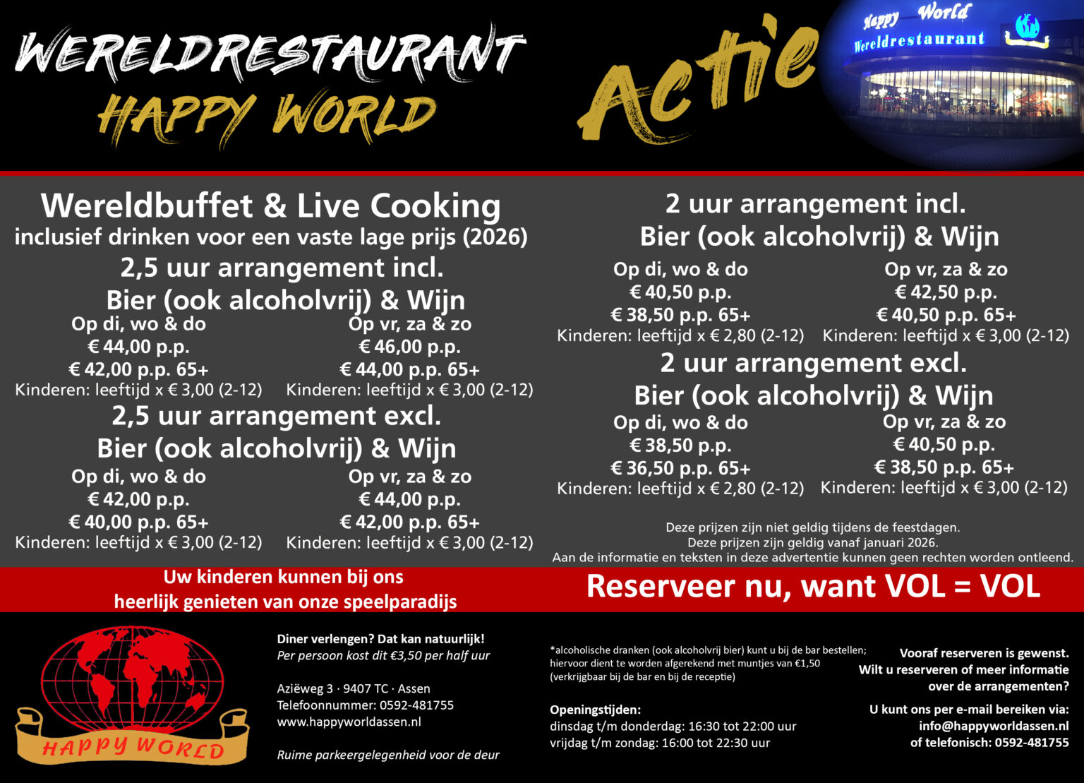Wilt u onbeperkt genieten van vele soorten gerechten? Dan bent u bij Happy World aan het juiste adres. Onze arrangementen zijn all-you-can-eat en inclusief onbeperkt frisdranken, verse sappen, koffie en thee. Ook aan de kinderen is gedacht: naast de speciale kindergerechten is er een aparte speelruimte (vanaf 3 jaar oud) onder toezicht van ons Kids-Team.